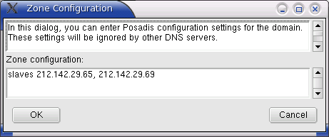 If, apart from your primary DNS server, there are also secondary DNS servers for the zone, you should let know Posadis about them. By default, Posadis only allows zone transfers to slaves for security resons, so you'll need to let Posadis know what the slave DNS servers are. You can do this from the Master File Editor by clicking the “Zone configuration” button, and entering the slaves in the dialog box as shown in Figure 10.