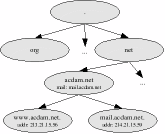 Another thing we're going to note from this figure, is the way data is stored in the Domain Name System: by means of data that is connected to the domain names. We're not going to go into great detail about how exactly this data is stored, but it is important to note that each domain name can have an arbitrary number of properties attached to it, of various types. For example, the domain name “www.acdam.net” has a piece of data of type “addr” connected to it, with the value “”. Our interpretation of this information would be that “www.acdam.net” has the IP address . Likewise, “acdam.net” has a piece of data of the “mail” type attached to it, with the value “mail.acdam.net”. We interpret this by saying that mail.acdam.net is the domain name of one of the mail servers that receive mail for the acdam.net domain.