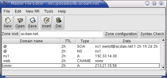 A primary DNS server, as you may remember from Figure 6 (page 10), is the one DNS server for a zone that stores the actual zone data. That zone data is stored in a so-called master file. This master file is stored in a format can be read by most DNS servers, including BIND and MS-DNS. Posadis comes with the Posadis Master File Editor, with which you can easily edit the data for your zone.