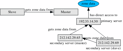 Now, and are both secondary DNS servers because they do not have direct access to the zone data. Still, there is a difference between them two, so we will need to introduce one other piece of terminology, the master-slave relationship, also shown in Figure 6. By definition, a slave gets its zone data from its master. In the “acdam.net” case, only serves zone transfers, so it is a master. only gets zone transfers, so it's a slave. And both serves and gets zone transfers, so we call it a slave master.