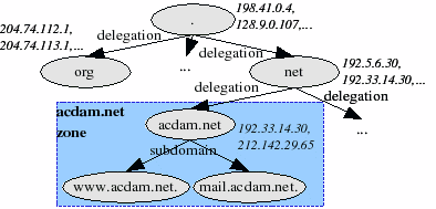 Now, we see that these DNS servers don't store information about the subdomains of “.”, “org” and “net”: the root nameservers have delegated the authority about these domain names to other nameservers. In this case, the root nameservers are only authoritative for “.”, and not for its subdomains. In case of the “acdam.net” domain, however, we see a different picture: the two nameservers for “acdam.net”, and , are authoritative for both “acdam.net” and its two subdomains. In general, a zone is the collection of the root domain for the zone and its non-delegated subdomains, so “.” is a zone of its own where “acdam.net” is in a zone with “www.acdam.net” and “mail.acdam.net”. Of course, “acdam.net” could also have delegated the “europe.acdam.net” domain, for example, to ACDAM's department in Europe, and in that case “europe.acdam.net” would not have been in the “acdam.net” zone.