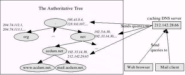 One thing to notice here, is that “” is apparently both authoritative for “net” and “acdam.net”. This is indeed a possibility, and in fact, many nameservers are authoritative for (much) more than one zone.