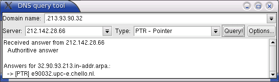 Luckily, you can do this with the Posadis DNS query tool. An example screenshot is shown in Figure 9. In this case, “e90032.upc-e.chello.nl” is apparently the domain name for the IP number . This method should only be used as a temporary solution.
