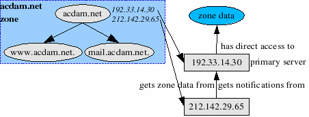 If you want to set up an authoritative DNS server though, this isn't quite all you need to know. When looking back to Figure 2, we saw that “acdam.net” had two nameservers. Obviously, we will want to make sure both DNS servers send out the same data for the zone. But how do we assure both servers have the same zone data? Though you keep the data on all DNS servers in sync yourself, DNS also has a system to do this automagically by means of zone transfers. This is displayed in Figure 5.
